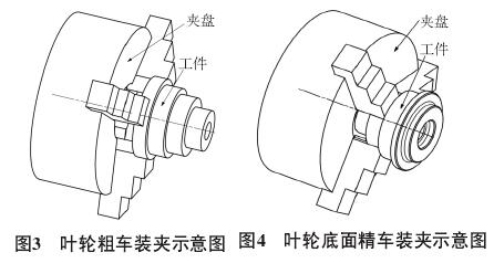 該葉輪分4次裝夾,毛坯選用圓柱棒料,第1次裝夾采用三爪夾盤夾持,完成葉輪打孔和粗車;第2次裝夾采用
