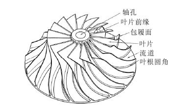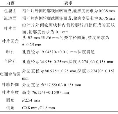本文所研究整體葉輪零件圖樣如圖1所示,該葉輪為半開放式整體葉輪,葉片數(shù)量為17,是某離心式空氣壓縮機的核心零件,葉輪三維結(jié)構(gòu)如圖2所示。該葉輪結(jié)構(gòu)比較復雜,葉片扭曲程度比較高,主要有葉片、流道、圓角、孔等特征。葉輪的主要加工難點為葉片面、流道面和葉根圓角,此位置加工時容易產(chǎn)生干涉,并且只能采用小刀具加工,效率低,葉輪內(nèi)孔尺寸要求以及內(nèi)孔與葉輪外輪廓的同軸度要求都比較高,零件主要加工內(nèi)容如表1所示。