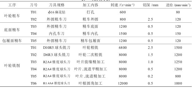三爪夾盤夾持,完成葉輪底面臺階圓、臺階孔精車;第3次裝夾采用三爪夾盤和軟爪夾持,完成葉輪孔和輪轂的精車;第4次裝夾采用專用夾具夾持,完成葉輪銑削加工。工藝路線制定如下:1)備料。0Cr17Ni4Cu4Nb棒料,尺寸為220 mm×95 mm。2)打孔。在數(shù)控車床上用三爪夾盤夾持,打孔直徑為16 mm,深度貫通。3)粗車。粗車葉輪輪轂面,留2 mm精車余量。4)精車葉輪底面。在數(shù)控車床上零件掉頭,用三爪夾盤夾持,精車葉輪底面臺階外圓和臺階孔。5)精車葉輪包履面。在數(shù)控車床上用三爪夾盤和軟爪夾持。葉輪底面臺階外圓,精車內(nèi)孔和輪轂面。6)葉輪粗銑。在五軸聯(lián)動加工中心上用專用夾具夾持,粗銑葉輪,流道方向和葉片方向各留0.5 mm精銑余量。7)粗銑葉片前緣。粗銑葉片前緣,留0.5mm精銑余量。8)葉片半精加工。半精加工葉片,葉片方向留0.2 mm精銑余量,流道方向留0.5 mm精銑余量。9)流道半精加工。半精加工流道,流道方向留0.2 mm精銑余量,葉片方向留0.5 mm精銑余量。10)葉片精加工。精加工葉片至零件圖樣要求。11)流道精加工。精加工流道至零件圖樣要求。12)葉根圓角精加工。精加工葉根圓角至零件圖樣要求。